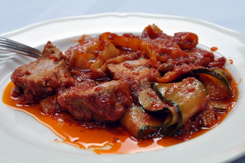 Cielęcina z warzywami w sosie pomidorowym Goccia d’oro .