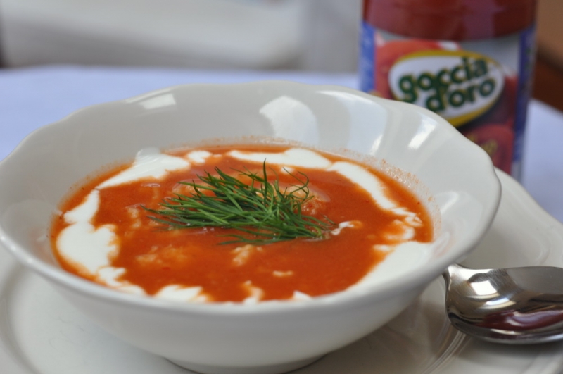 Zupa pomidorowa z sosem pomidorowym Passata di Pomodoro Goccia d’oro z kluseczkami z lanego ciasta